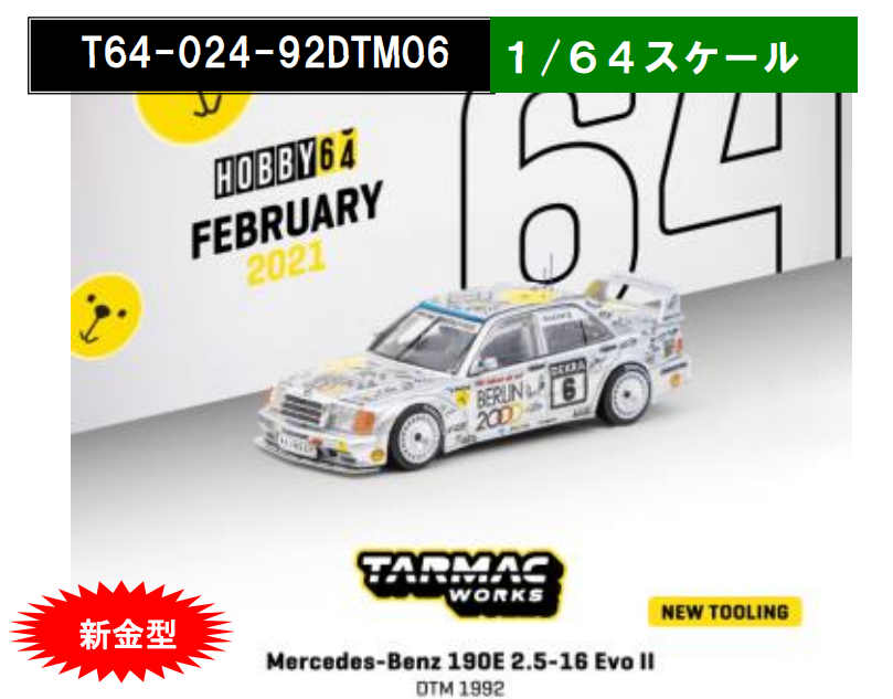 「Mercedes-Benz 190 E 2.5-16 Evo II DTM 1992」 を新規金型 1/64スケールダイキャスト素材でモデル化。フロントリップ、リヤウィング、ライト類、ミラーは別パーツとし、複雑なマーク類はタンポ印刷とデカールで再現しました。ディスプレイケース付き。